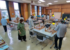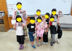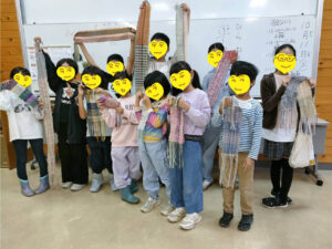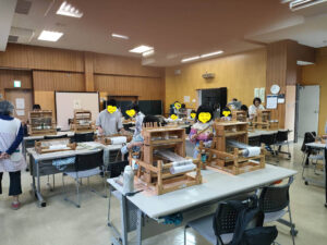 10月4日と11日、チャレンジ富様開催の機織り体験講座を行いました。 曇りや雨でちょっと寒いけど、機織りに熱中してみんな元気でした。